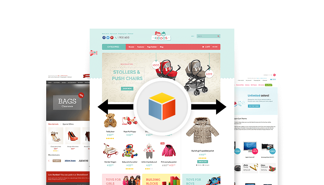 Products, categories, information pages, menus, sidebars and theme settings will be created for you with a single click. You can choose which of the demo designs to import. For customers with existing stores and content, there is the option to import only the theme design.