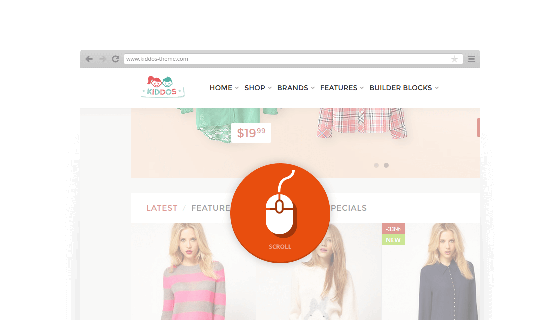 In most of the websites as soon we start scrolling down the page the header navigation is left out of the visible window area. The user must scroll back to the top of the website in order to access it. The Kiddos sticky header solves this annoying issue - it sticks at the top of the page and stands always at your disposal.