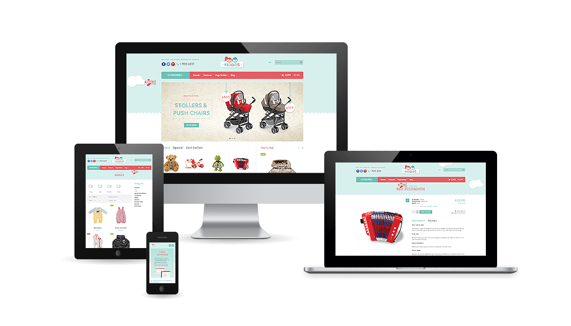 Kiddos is not only cross-browser compatible. It is built to support devices with different resolutions. The theme can adapt to every screen size thanks to its responsiveness - all assets scale down to fit the smaller screen space. Products per row adjust automatically based on what you've set in the theme options panel. Also the theme’s navigation controls support touch swipe functionality where appropriate (sliders or carousels e.g.). Hover dropdown menus are supported as well.