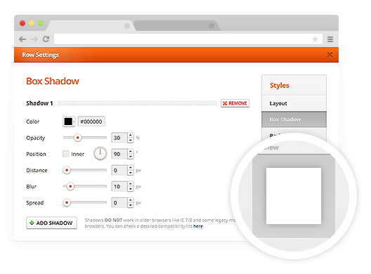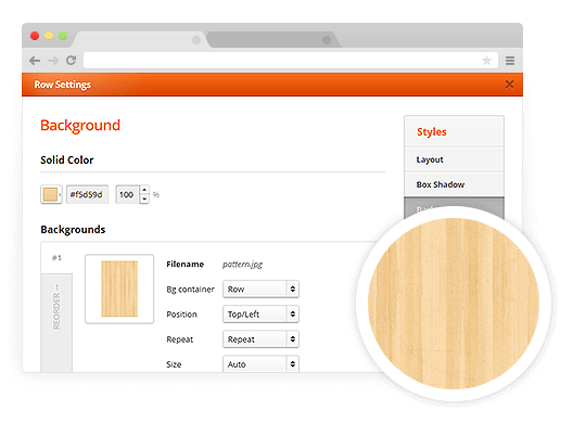 You can control the margin, padding and column spacing for each area, define column size, set border and border radius, apply multiple shadows and attach multiple backgrounds. Backgrounds can be either images, or linear and radial gradients.