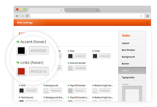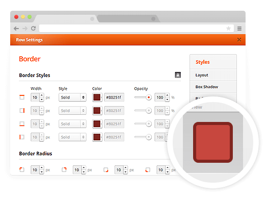 Quickly manage border style, width, color and opacity. You can also control border radius of each area, row and content block.